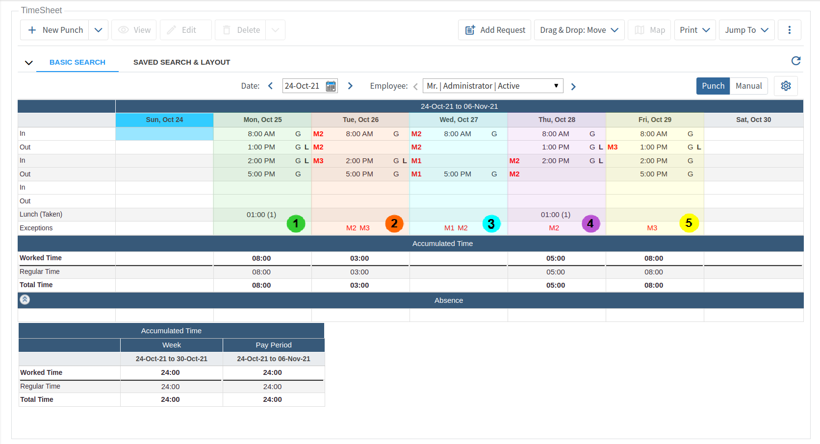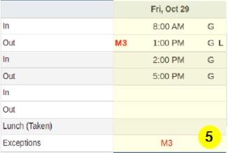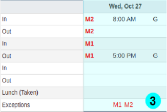 Refer to the image above for the corresponding numbered examples. See also Punching In/Out and Exceptions.