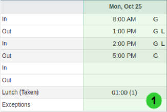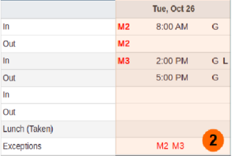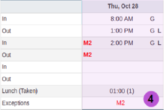 - Exception policy codes - displayed on the left side of punch in/out cells and also in the Exceptions row. Exceptions are in red text in the Example below.TIP: If you hover over an exception code a pop-up box will display the exception name.